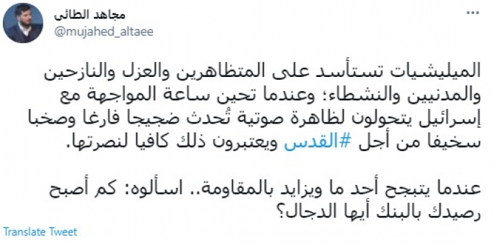 وكتب في تغريدة عبر "تويتر" رصدها "المشهد العربي": "المليشيات تستأسد على المتظاهرين والعزل والنازحين والمدنيين والنشطاء؛ وعندما تحين ساعة المواجهة مع إسرائيل يتحولون لظاهرة صوتية تُحدث ضجيجا فارغا وصخبا سخيفا من أجل القدس ويعتبرون ذلك كافيا لنصرتها".
