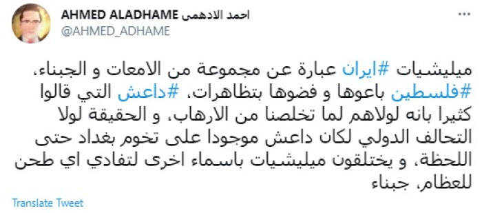 وقال في تغريدة عبر "تويتر" رصدها "المشهد العربي": "مليشيات إيران عبارة عن مجموعة من الجبناء، فلسطين باعوها وفضوها بتظاهرات، داعش التي قالوا كثيرا بأنه لولاهم لما تخلصنا من الإرهاب".