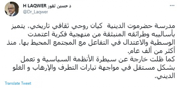 وقال في تغريدة عبر "تويتر" رصدها "المشهد العربي": "مدرسة حضرموت الدينية كيان روحي ثقافي تاريخي، يتميز بأساليبه وطرائقه المنبثقة من منهجية فكرية اعتمدت الوسطية والاعتدال في التفاعل مع المجتمع المحيط بها، منذ أكثر من ألف عام".