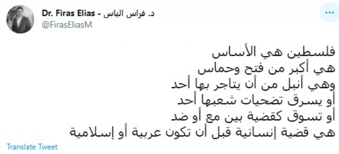 وكتب في تغريدة عبر "تويتر" رصدها "المشهد العربي": "فلسطين هي الأساس هي أكبر من فتح وحماس وهي أنبل من أن يتاجر بها أحد أو يسرق تضحيات شعبها أحد أو تسوق كقضية بين مع أو ضد هي قضية إنسانية قبل أن تكون عربية أو إسلامية".