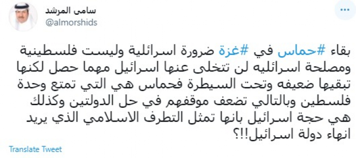 وكتب في تغريدة عبر "تويتر" رصدها "المشهد العربي": "بقاء حماس في غزة ضرورة إسرائيلية وليست فلسطينية ومصلحة إسرائيلية لن تتخلى عنها إسرائيل مهما حصل لكنها تبقيها ضعيفة وتحت السيطرة".