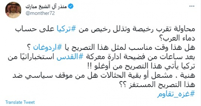 وقال في تغريدة عبر "تويتر" رصدها "المشهد العربي": "محاولة تقرب رخيصة وتذلل رخيص من تركيا على حساب دماء العرب؟ هل هذا وقت مناسب لمثل هذا التصريح يا أردوغان؟".