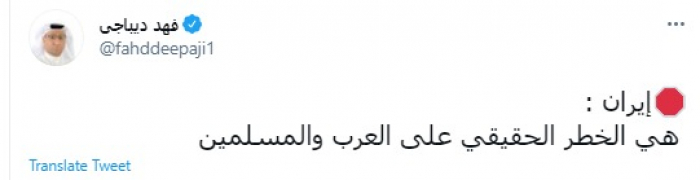 وقال في تغريدة عبر "تويتر" رصدها "المشهد العربي": "إيران: هي الخطر الحقيقي على العرب والمسلمين".