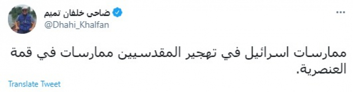 وقال في تغريدة عبر "تويتر" رصدها "المشهد العربي": "ممارسات اسرائيل في تهجير المقدسيين ممارسات في قمة العنصرية".