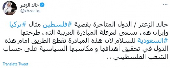 وقال في تغريدة عبر "تويتر" رصدها "المشهد العربي": "الدول المتاجرة بقضية فلسطين مثال تركيا وإيران هي تسعى لعرقلة المبادرة العربية التي طرحتها السعودية للسلام".