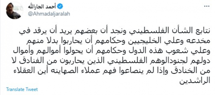 وقال في تغريدة عبر "تويتر" رصدها "المشهد العربي": "نتابع الشأن الفلسطيني ونجد أن بعضهم يريد أن يرقد في مخدعه وعلي الخليجيين وحكامهم أن يحاربوا بدلا منهم".