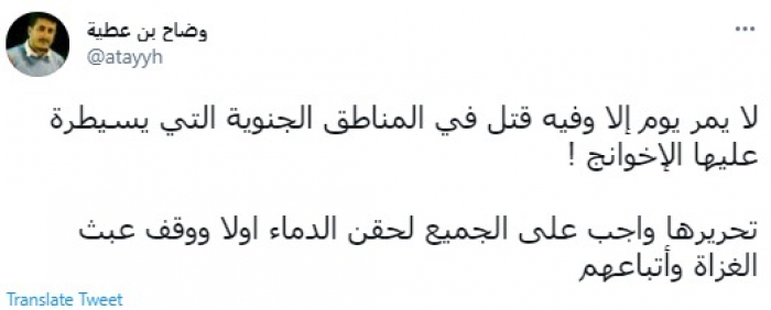 وقال في تغريدة عبر "تويتر" رصدها "المشهد العربي": "لا يمر يوم إلا وفيه قتل في المناطق الجنويية التي يسيطر عليها الإخوانج".