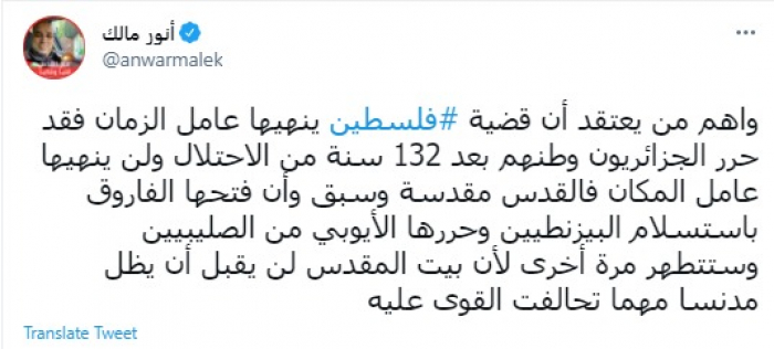 توقع الإعلامي والمراقب الدولي الجزائري الدكتور أنور مالك، اليوم، اقتراب تحرير فلسطين من الاحتلال الإسرائيلي، مؤكدًا أن عامل الزمان والمكان لن ينهي تلك القضية، مشيرًا إلى أن الشعب الجزائري حرر وطنه من الاحتلال الفرنسي بعد 132 عام.