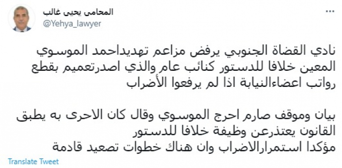 وقال في تغريدة عبر "تويتر" رصدها "المشهد العربي": "نادي القضاة الجنوبي يرفض مزاعم وتهديدات أحمد الموسوي المعين خلافا للدستور كنائب عام والذي أصدر تعميم بقطع رواتب أعضاء النيابة إذا لم يرفعوا الإضراب".