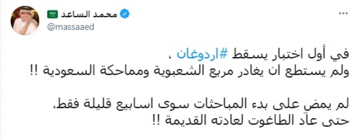 وقال في تغريدة عبر "تويتر" رصدها "المشهد العربي": "في أول اختبار يسقط أردوغان، ولم يستطع أن يغادر مربع الشعبوية ومماحكة السعودية.. لم يمضِ على بدء المباحثات سوى اسابيع قليلة فقط، حتى عاد لعادته القديمة".