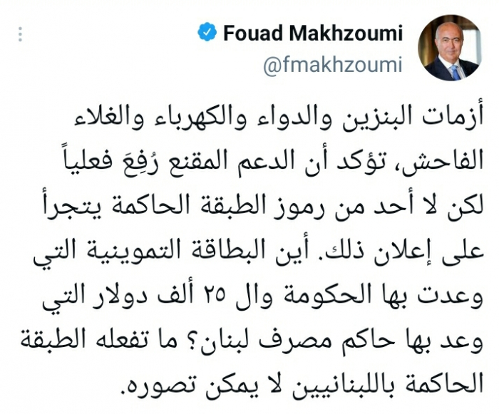 مخزومي يتهم الحكومة اللبنانية برفع الدعم بشكل سري