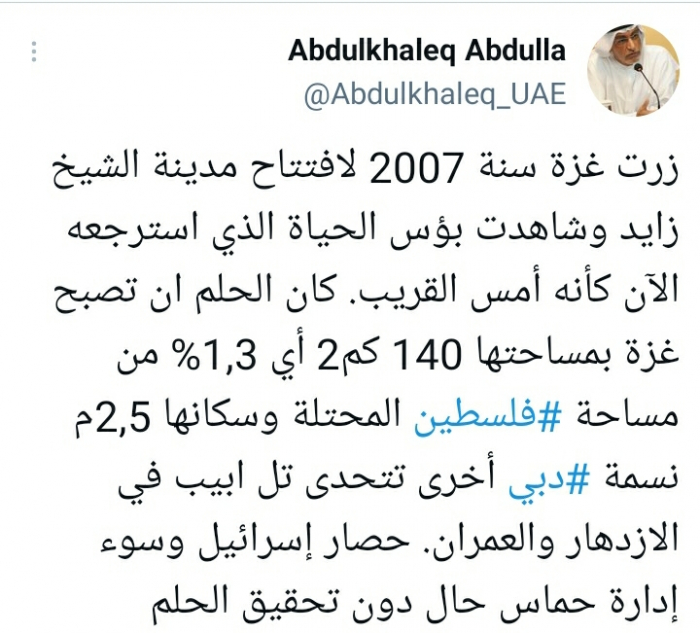 قال الأكاديمي الإماراتي عبدالخالق عبدالله، إن الحصار الإسرائيلي وسوء إدارة حركة حماس لقطاع غزة، منعا تحوله إلى دبي أخرى.