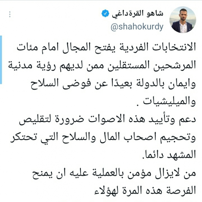 واعتبر في تغريدة على حسابه بموقع التدوين المصغر تويتر، اليوم أن: "الانتخابات الفردية تفتح المجال أمام مئات المرشحين المستقلين ممن لديهم رؤية مدنية وإيمان بالدولة بعيدًا عن فوضى السلاح والميليشيات".