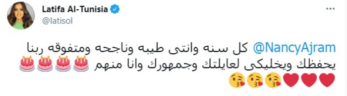 وكتبت لطيفة، عبر حسابها على تويتر:" كل سنة وانتي طيبة وناجحة ومتفوقة يا نانسي، وربنا يحفظك ويخليكي لعائلتك وجمهورك وأنا منهم".