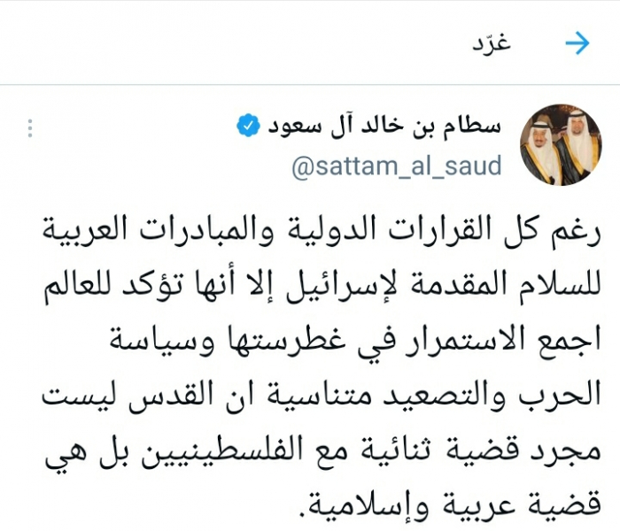 استهجن الأمير السعودي سطام بن خالد آل سعود، الغطرسة الإسرائيلية أمام القرارات الدولية والمبادرات العربية للسلام.