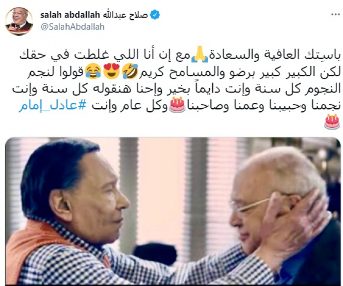 ونشر"عبدالله" صورة تجمعهما من أحد الأعمال، عبر حسابه الرسمي بموقع "تويتر"، علق :"باستك العافية والسعادة، مع إن أنا اللي غلطت في حقك لكن الكبير كبير برضو والمسامح كريم، قولوا لنجم النجوم كل سنة وأنت دايما بخير واحنا هنقوله كل سنة وأنت نجمنا وحبيبنا وعمنا وصاحبنا، كل عام وأنت عادل إمام".