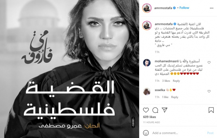 ونشر "مصطفى"، بوستر الأغنية عبر حسابه بموقع "إنستجرام"، والتي تغنيها الفنانة مي فاروق، وعلق: "الآن أغنية القضية فلسطينية على جميع المنصات".
