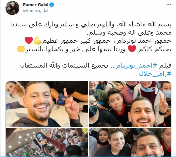 ونشر رامز، الصور، عبر حسابه على تويتر، وعلق: "بسم الله ما شاء الله، واللهم صلي وسلم وبارك على سيدنا محمد وعلى آله وصحبه وسلم .. جمهور أحمد نوتردام، جمهور كبير، جمهور عظيم .. بحبكم كلكم .. وربنا يتمها على خير ويكملها بالستر .. فيلم أحمد نوتردام .. بجميع السينمات والله المستعان".