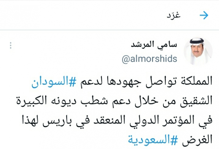 وأكد في تغريدة على حسابه بموقع التدوين المصغر تويتر، اليوم أن: "المملكة تواصل جهودها لدعم السودان الشقيق من خلال دعم شطب ديونه الكبيرة في المؤتمر الدولي المنعقد في باريس لهذا الغرض".