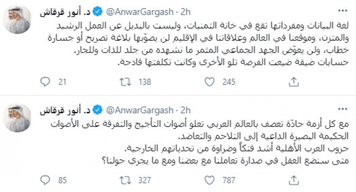 قرقاش: أصوات التفرقة تعلو مع كل أزمة حادة بالعالم العربي