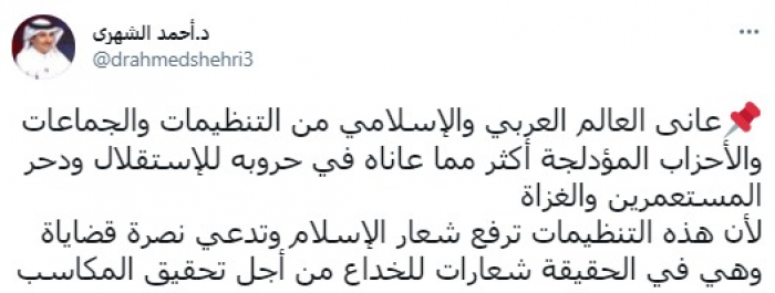 وكتب في تغريدة عبر "تويتر" رصدها "المشهد العربي": "عانى العالم العربي والإسلامي من التنظيمات والجماعات والأحزاب المؤدلجة أكثر مما عاناه في حروبه للإستقلال ودحر المستعمرين والغزاة".