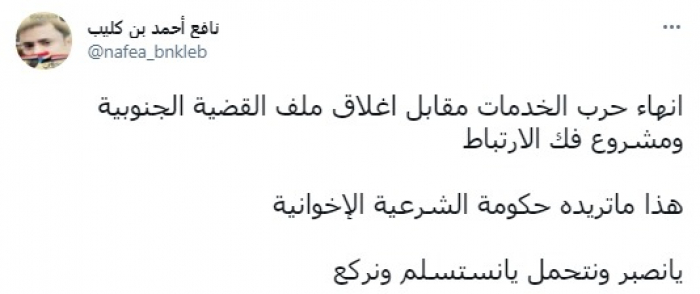 وقال في تغريدة عبر "تويتر" رصدها "المشهد العربي": "إنهاء حرب الخدمات مقابل إغلاق ملف القضية الجنوبية ومشروع فك الارتباط".