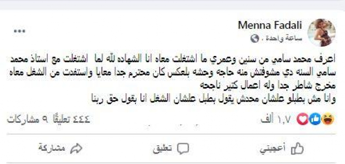 وكتبت "منة" عبر حسابها بموقع "فيسبوك": "أعرف محمد سامي من سنين، وعمري ما اشتغلت معاه، أنا الشهادة لله لما اشتغلت مع أستاذ محمد سامي السنة دي مشوفتش منه حاجة وحشة".