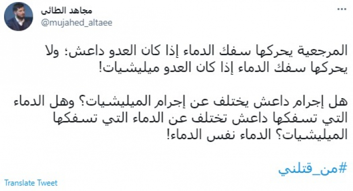 وكتب في تغريدة عبر "تويتر" رصدها "المشهد العربي": "المرجعية يحركها سفك الدماء إذا كان العدو داعش؛ ولا يحركها سفك الدماء إذا كان العدو مليشيات.. هل إجرام داعش يختلف عن إجرام المليشيات؟ وهل الدماء التي تسفكها داعش تختلف عن الدماء التي تسفكها المليشيات؟ الدماء نفس الدماء".