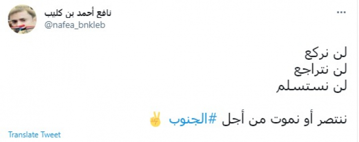 وقال في تغريدة عبر "تويتر" رصدها "المشهد العربي": "لن نركع لن نتراجع لن نستسلم.. ننتصر أو نموت من أجل الجنوب".