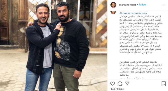 ونشر "مهران" صورة تجمعه مع محمد سامي، عبر حسابه على "إنستجرام"، وعلّق: "الراجل ده مكناش صحاب.. شافني مرة في المسرح في ٢٠١٥ وقالي إننا هنشتغل مع بعض ومشفتوش بعدها غير سنة ٢٠٢٠ لما اشتغلت معاه في مسلسل (البرنس) ومن بعدها بقينا نشتغل مع بعض".