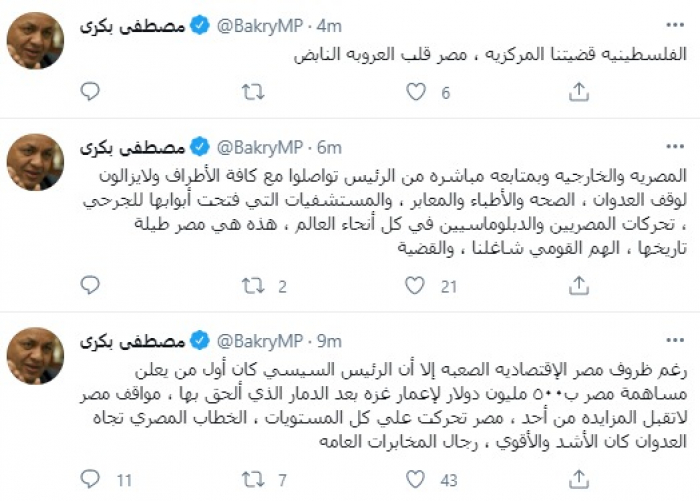 وقال في تغريدات عبر "تويتر" رصدها "المشهد العربي": "رغم ظروف مصر الاقتصادية الصعبة إلا أن الرئيس السيسي كان أول من يعلن مساهمة مصر ب٥٠٠ مليون دولار لإعمار غزة بعد الدمار الذي ألحق بها مواقف مصر لا تقبل المزايدة من أحد".