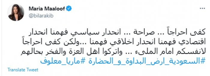 وقالت في تغريدة عبر "تويتر" رصدها "المشهد العربي": "كفى إحراجاً ... صراحة ... انحدار سياسي فهمنا انحدار اقتصادي فهمنا انحدار اخلاقي فهمنا ...ولكن كفى احراجاً لانفسكم امام الملىء ... واتركوا أهل العزة والفخر بحالهم".