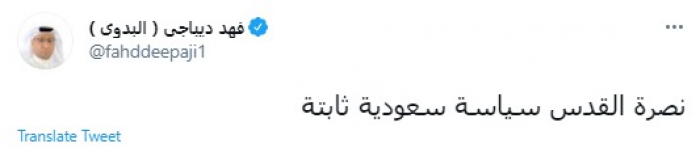 وكتب في تغريدة عبر "تويتر" رصدها "المشهد العربي": "نصرة القدس سياسة سعودية ثابتة".