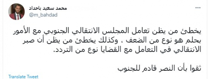 وكتب في تغريدة عبر "تويتر" رصدها "المشهد العربي": "يخطئ من يظن تعامل المجلس الانتقالي الجنوبي مع الأمور بحلم هو نوع من الضعف، وكذلك يخطئ من يظن أن صبر الانتقالي في التعامل مع القضايا نوع من التردد".