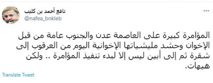 وقال في تغريدة عبر "تويتر" رصدها "المشهد العربي": "المؤامرة كبيرة على العاصمة عدن والجنوب عامة من قبل الإخوان".