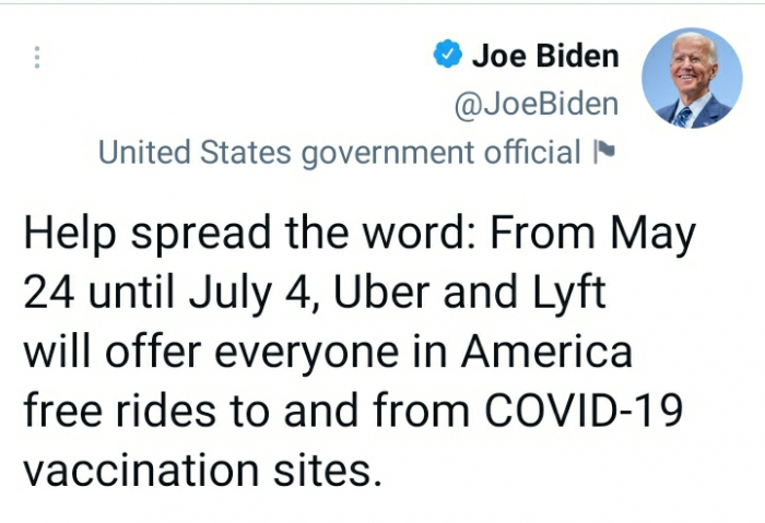 وقال في تغريدة على حسابه بموقع التدوين المصغر تويتر، اليوم إنه: "ساعد في نشر الخبر: من 24 مايو حتى 4 يوليو، ستقدم شركتا أوبر وليفت للجميع في أمريكا رحلات مجانية من وإلى مواقع التطعيم ضد فيروس كورونا".