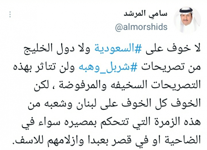 وأشار في تغريدة على حسابه بموقع التدوين المصغر تويتر، اليوم إلى أنه: "لا خوف على السعودية ولا دول الخليج من تصريحات شربل وهبة، ولن تتأثر بهذه التصريحات السخيفة والمرفوضة".