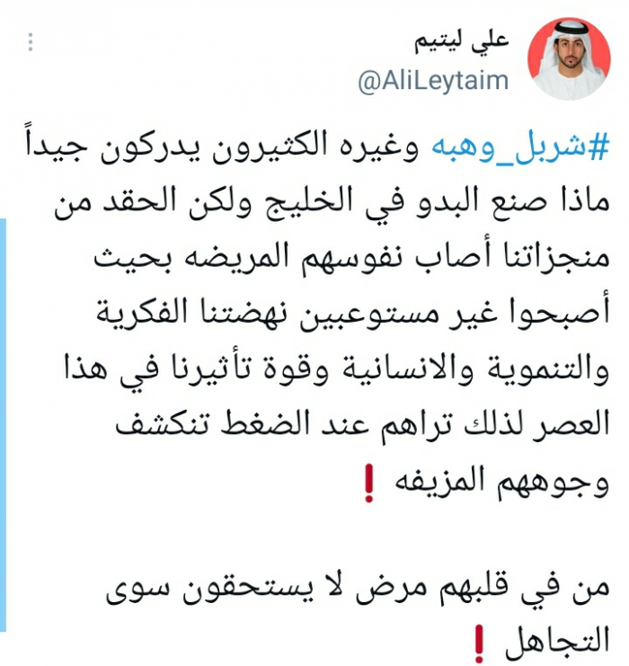 وقال في تغريدة على حسابه بموقع التدوين المصغر تويتر، اليوم إنه: "شربل وهبة وغيره الكثيرون يدركون جيداً ماذا صنع البدو في الخليج".
