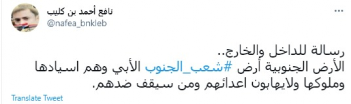 وقال في تغريدة عبر "تويتر" رصدها "المشهد العربي": "رسالة للداخل والخارج.. الأرض الجنوبية أرض شعب الجنوب الأبي وهم أسيادها وملوكها ولا يهابون أعدائهم ومن سيقف ضدهم".