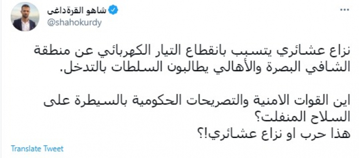 علق الكاتب الصحفي العراقي شاهو القرةداغي، اليوم، على واقعة وقوع نزاع عشائري في محافظة البصرة بالعراق وسط غياب أمني وحكومي.