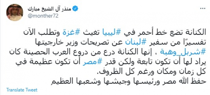 وقال في تغريدة عبر "تويتر" رصدها "المشهد العربي": "الكنانة تضع خط أحمر في ليبيا تغيث غزة وتطلب الآن تفسيرًا من سفير لبنان عن تصريحات وزير خارجيتها شربل وهبة".