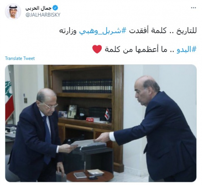 وقال في تغريدة عبر "تويتر" رصدها "المشهد العربي": "للتاريخ .. كلمة أفقدت شربل وهبي وزارته البدو .. ما أعظمها من كلمة".
