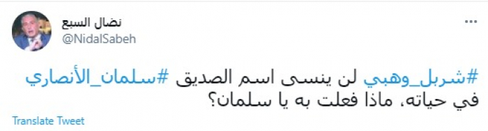 وقال في تغريدة عبر "تويتر" رصدها "المشهد العربي": "شربل وهبة لن ينسى اسم الصديق سلمان الأنصاري في حياته، ماذا فعلت به يا سلمان؟".