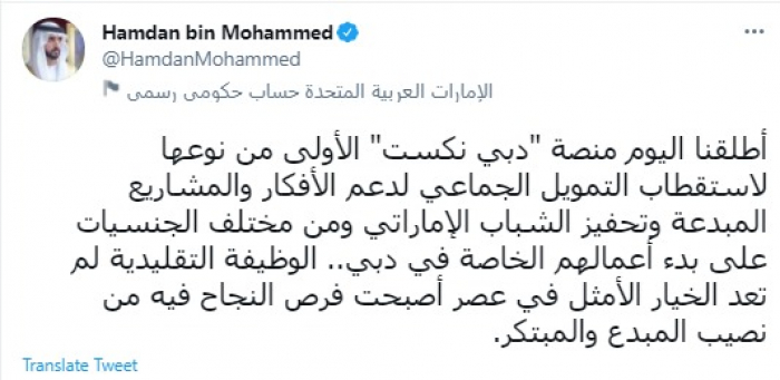وقال في تغريدة عبر "تويتر" رصدها "المشهد العربي": "أطلقنا اليوم منصة دبي نكست الأولى من نوعها لاستقطاب التمويل الجماعي لدعم الأفكار والمشاريع المبدعة وتحفيز الشباب الإماراتي ومن مختلف الجنسيات على بدء أعمالهم الخاصة في دبي.. الوظيفة التقليدية لم تعد الخيار الأمثل في عصر أصبحت فرص النجاح فيه من نصيب المبدع والمبتكر".