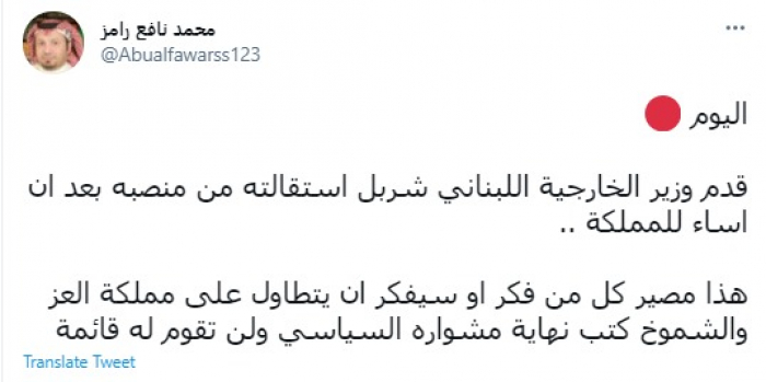 وقال في تغريدة عبر "تويتر" رصدها "المشهد العربي": "اليوم.. قدم وزير الخارجية اللبناني شربل استقالته من منصبه بعد أن أساء للمملكة ..هذا مصير كل من فكر أو سيفكر أن يتطاول على مملكة العز والشموخ كتب نهاية مشواره السياسي ولن تقوم له قائمة".
