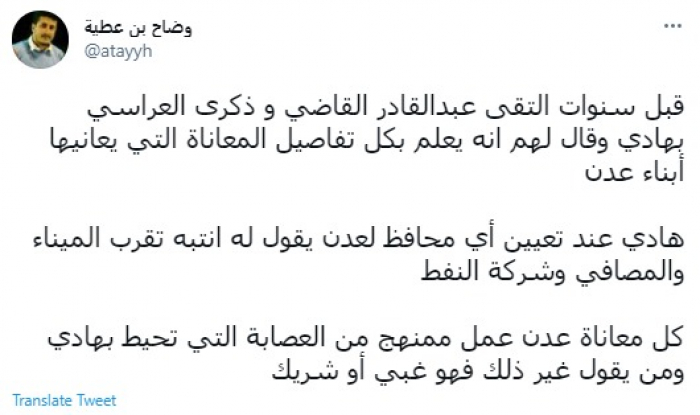وقال في تغريدة عبر "تويتر" رصدها "المشهد العربي": "قبل سنوات التقى عبدالقادر القاضي و ذكرى العراسي بهادي وقال لهم إنه يعلم بكل تفاصيل المعاناة التي يعانيها أبناء عدن".