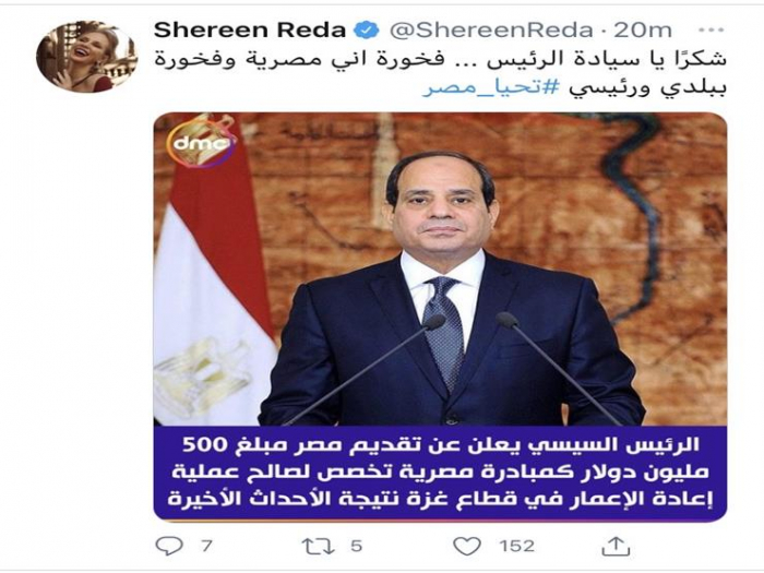 وجهت الفنانة المصرية شيرين رضا رسالة للرئيس عبدالفتاح السيسي، على خلفية إعلانه تقديم مصر ٥٠٠ مليون دولار لصالح عملية إعادة الإعمار في غزة.