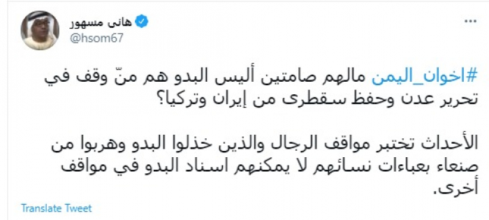 وقال في تغريدة عبر "تويتر" رصدها "المشهد العربي": "إخوان اليمن مالهم صامتين أليس البدو هم منّ وقف في تحرير عدن وحفظ سقطرى من إيران وتركيا؟".