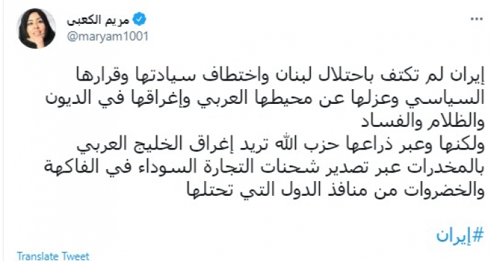 وقالت في تغريدة عبر "تويتر" رصدها "المشهد العربي": "إيران لم تكتف باحتلال لبنان واختطاف سيادتها وقرارها السياسي وعزلها عن محيطها العربي وإغراقها في الديون والظلام والفساد".