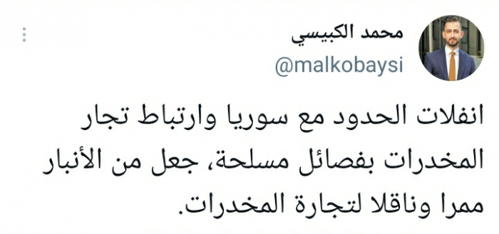 وقال في تغريدة على حسابه بموقع التدوين المصغر تويتر، اليوم إن: "انفلات الحدود مع سوريا وارتباط تجار المخدرات بفصائل مسلحة، جعل من الأنبار ممرا وناقلا لتجارة المخدرات".